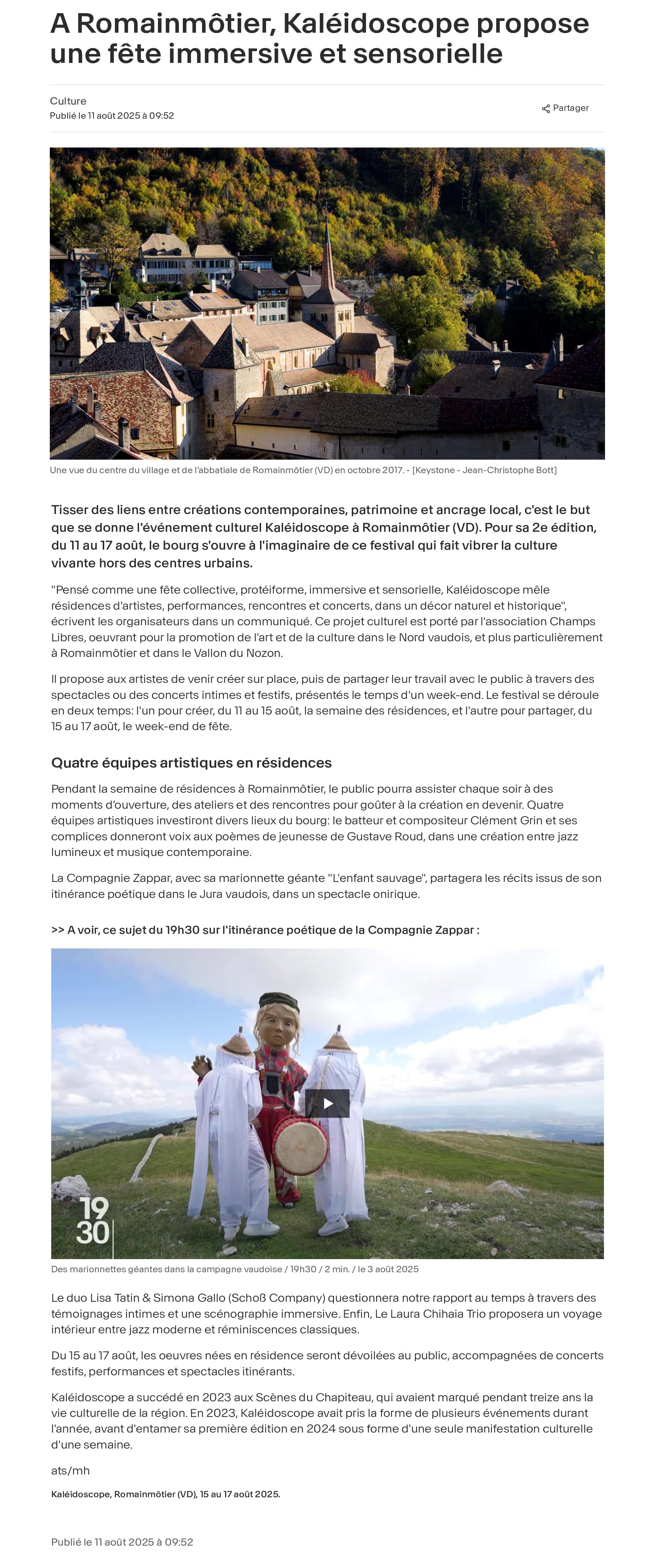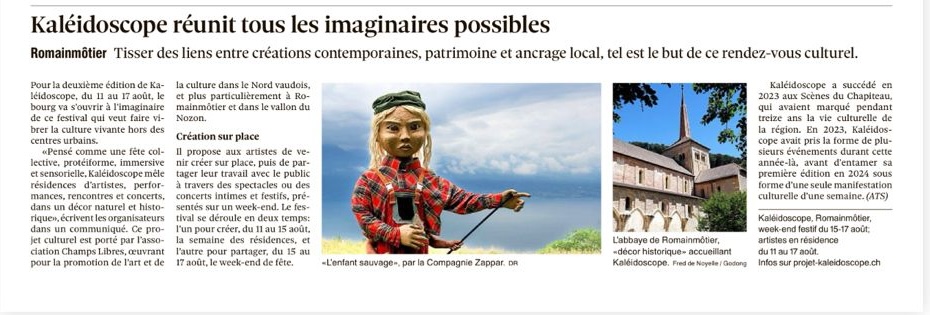 Chaque édition de Kaléidoscope attire l’attention des médias, curieux de découvrir nos projets artistiques et la magie qui s’invite à Romainmôtier.